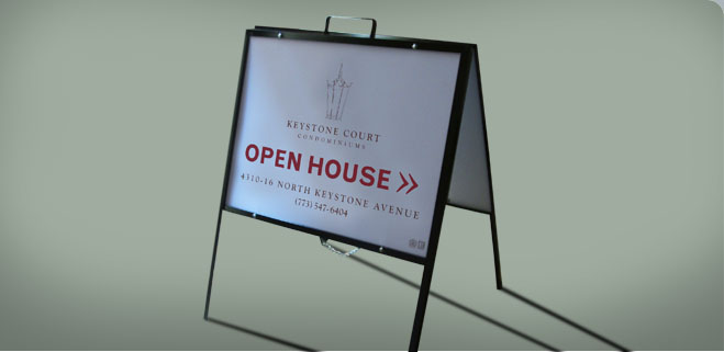 This sign was designed to be located on the sidewalk in front of this project during open house events.